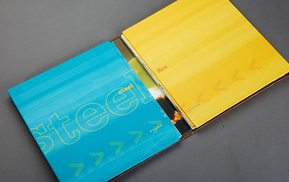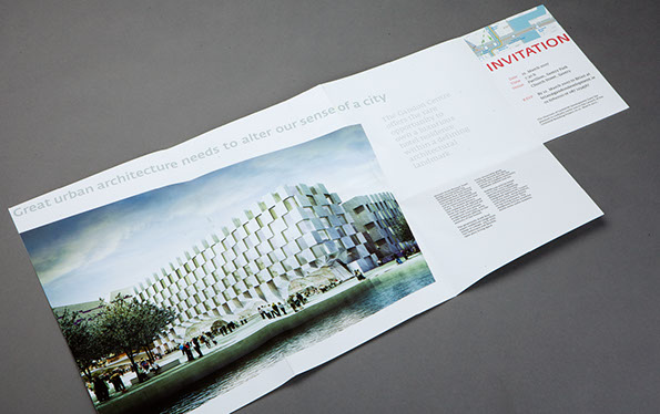 Hochwertige Einladung zum Baubeginn des Gandon Theaters (später: Bord Gáis Energy Theatre) in Dublin. Mit schräger Stanze, cleverer Falzung und partiellem Metalllack.