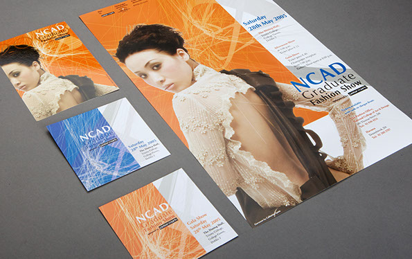 Poster, Postkarten, Eintrittskarten für die Modeschau des NCAD in Dublin (Irland).